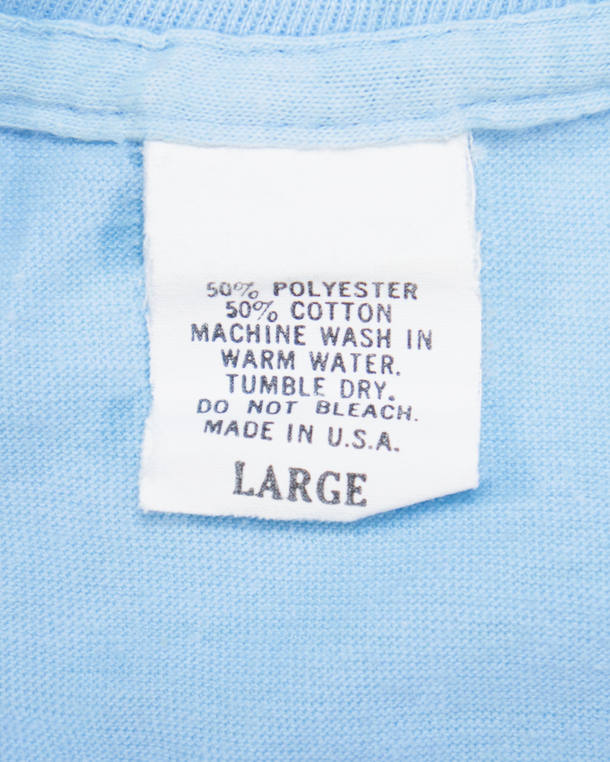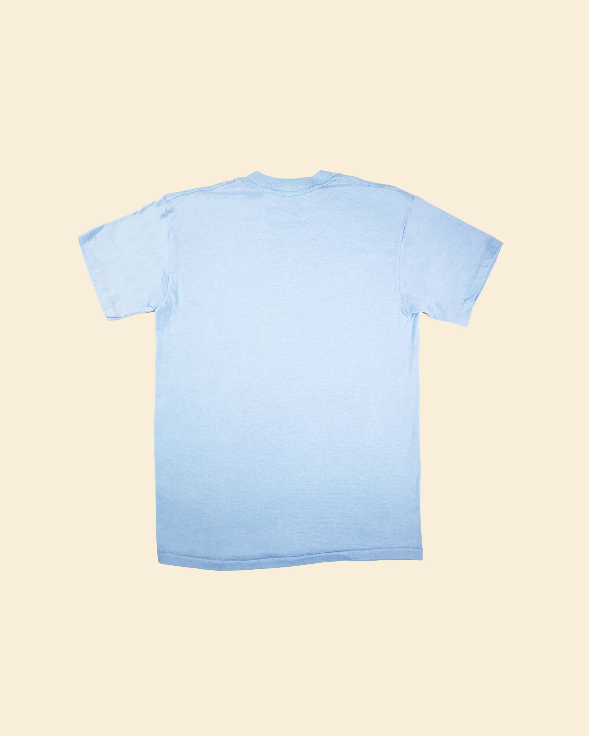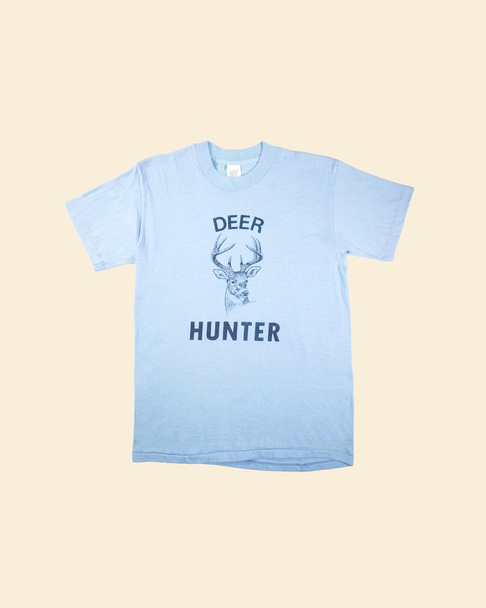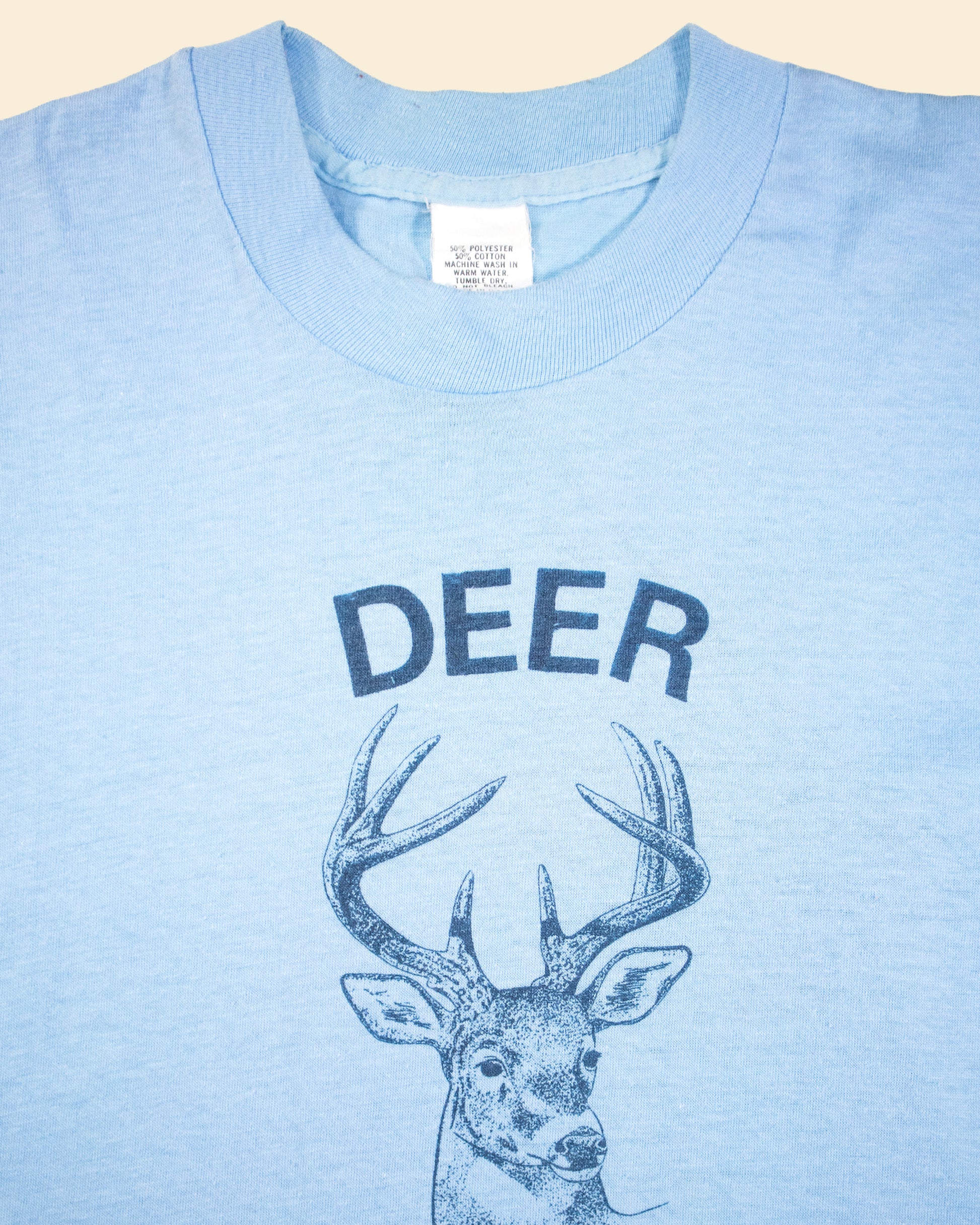 A 1970s graphic t-shirt featuring hand-rendered deer illustration and bold block typography printed on soft blue cotton. The piece reflects American hunting culture and rural iconography as everyday casual expression during the decade.