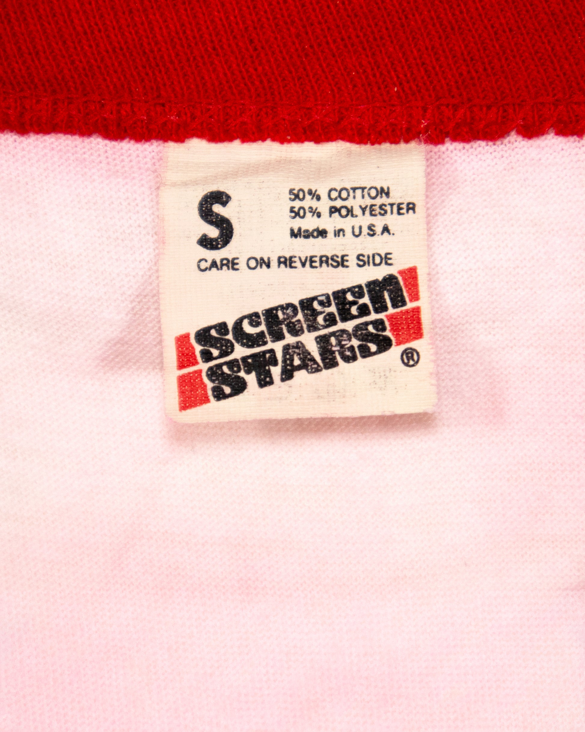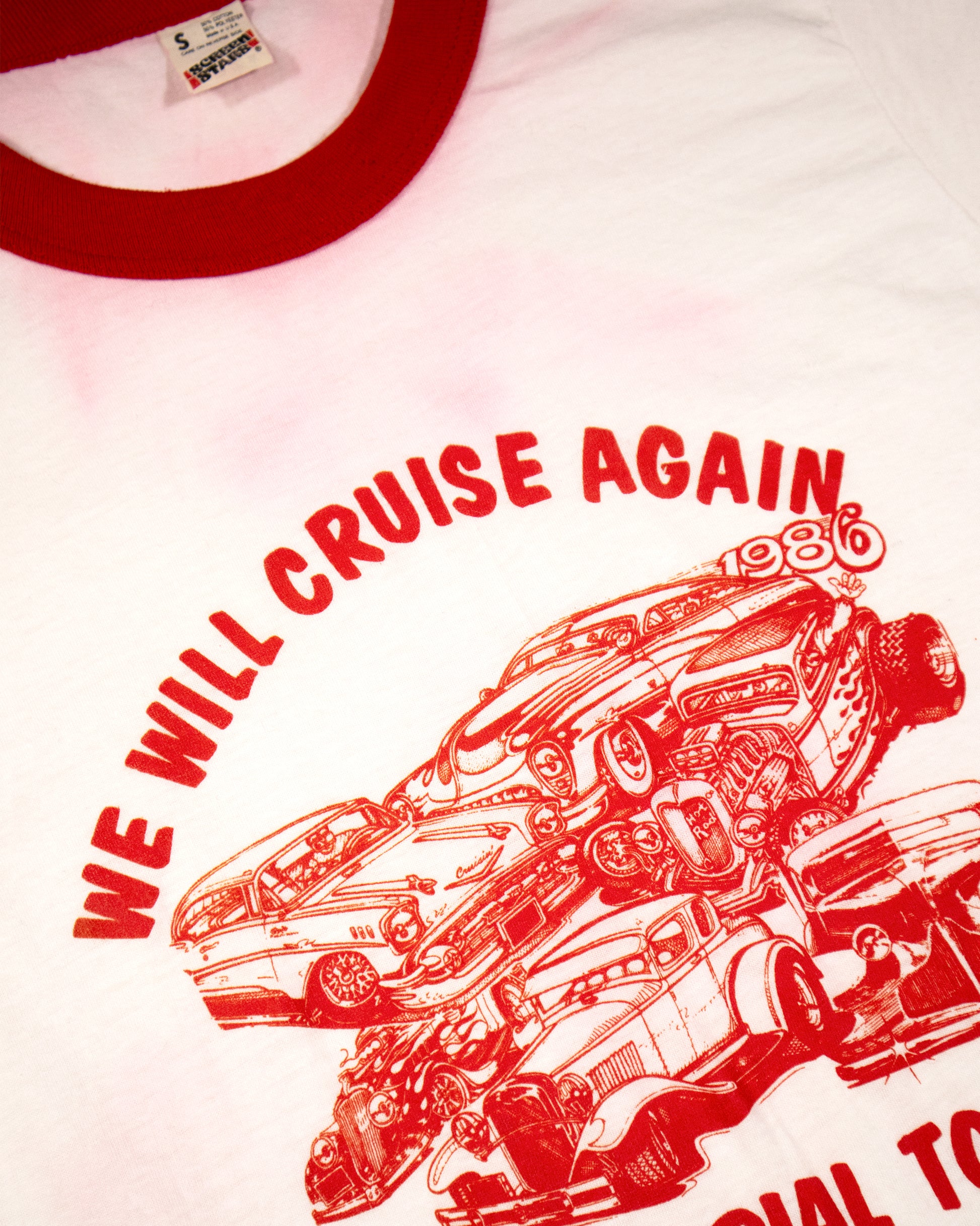 An early 1980s ringer t-shirt featuring an automotive tribute illustration printed on soft cotton. The piece reflects grassroots car culture and the communal nostalgia tied to cruising scenes disrupted by changing urban policies in the mid-1980s.